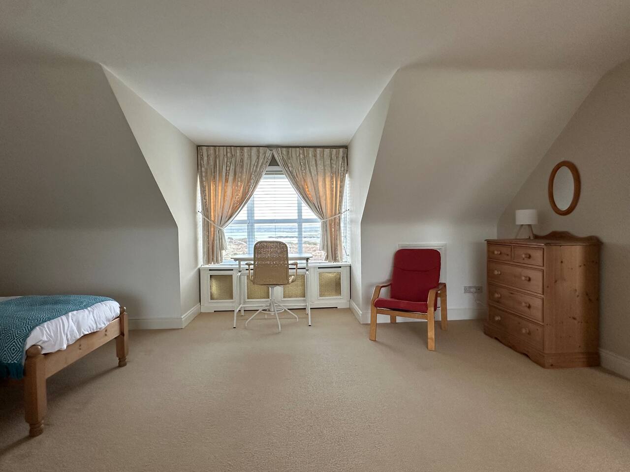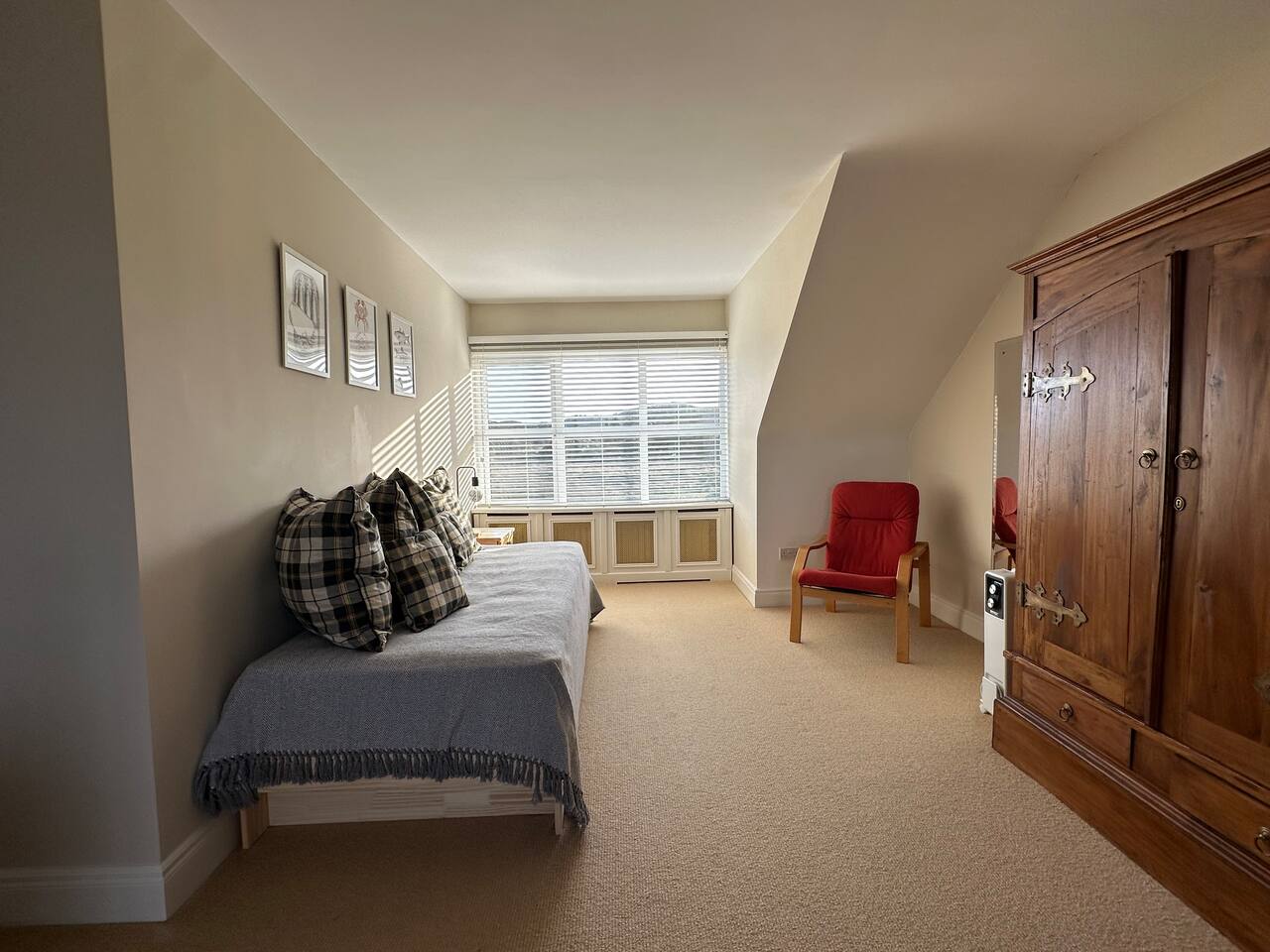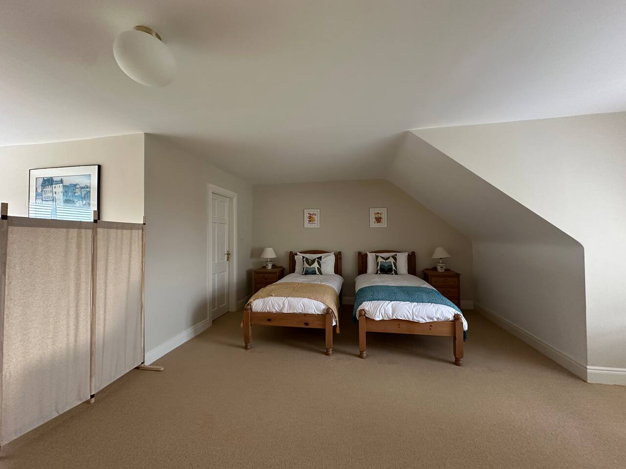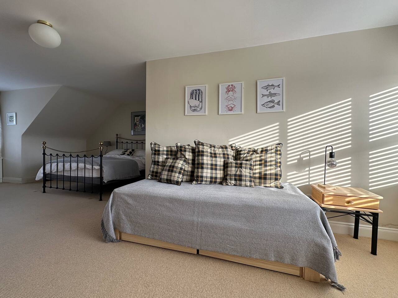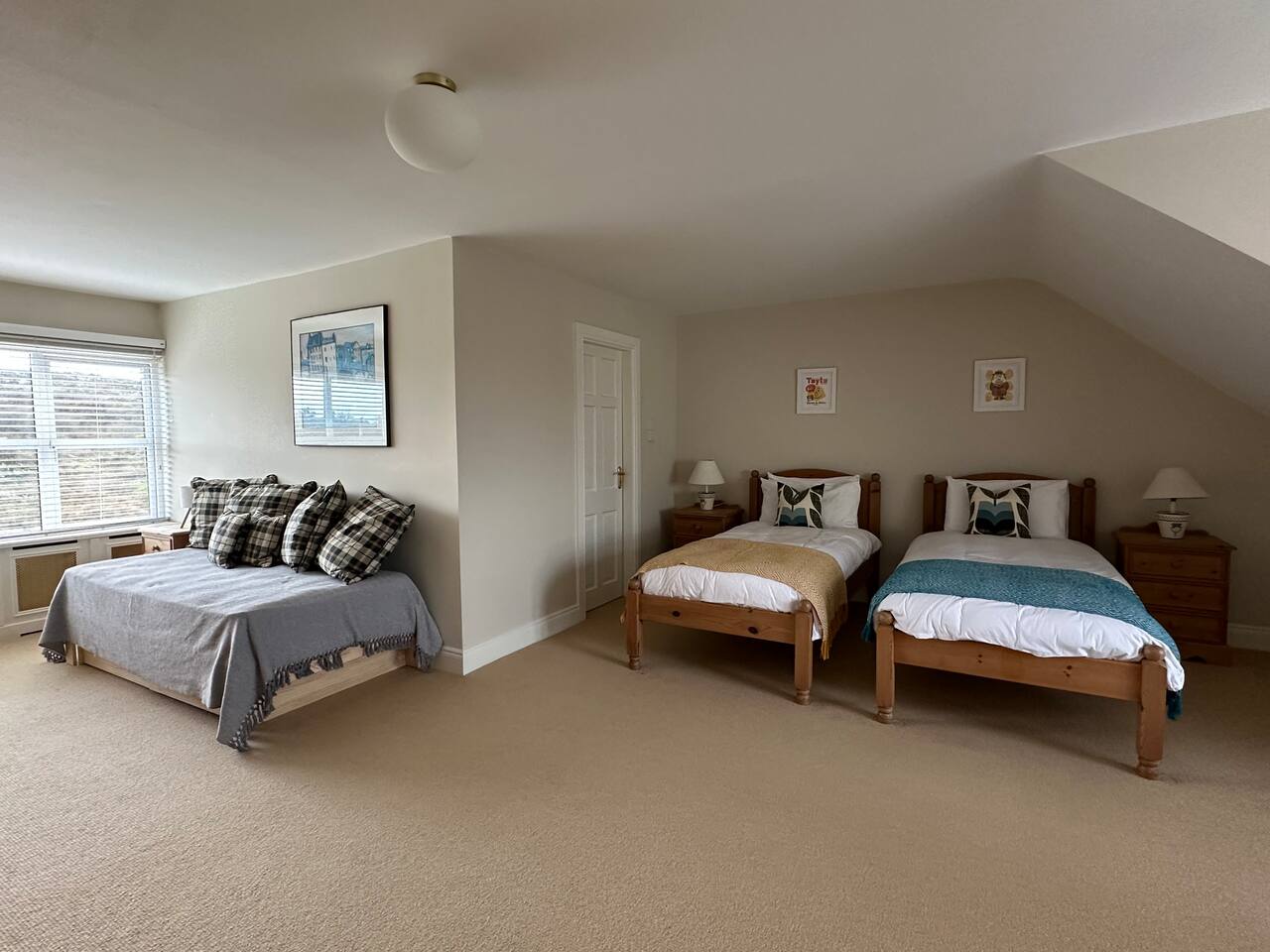 All three bedrooms are enormous and have en-suite bathrooms. The downstairs bedroom has a king-sized bed; one upstairs bedroom also has a king-sized bed, while the other has two twin beds. Both upstairs bedrooms, as well as the upstairs observatory, also have a double pull-out sofa. On top of that there's foldaway single bed, as well as a cot for babies.